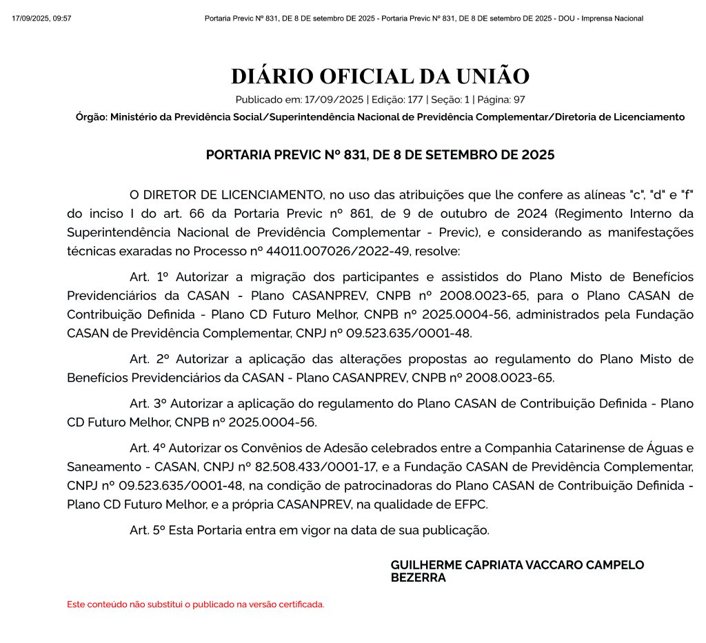 A Superintendência Nacional de Previdência Complementar (PREVIC) publicou no Diário Oficial da União, em 17 de setembro de 2025, a Portaria nº 831, autorizando a criação do novo plano de benefícios da CASANPREV: o Plano CASAN de Contribuição Definida – Plano CD Futuro Melhor.